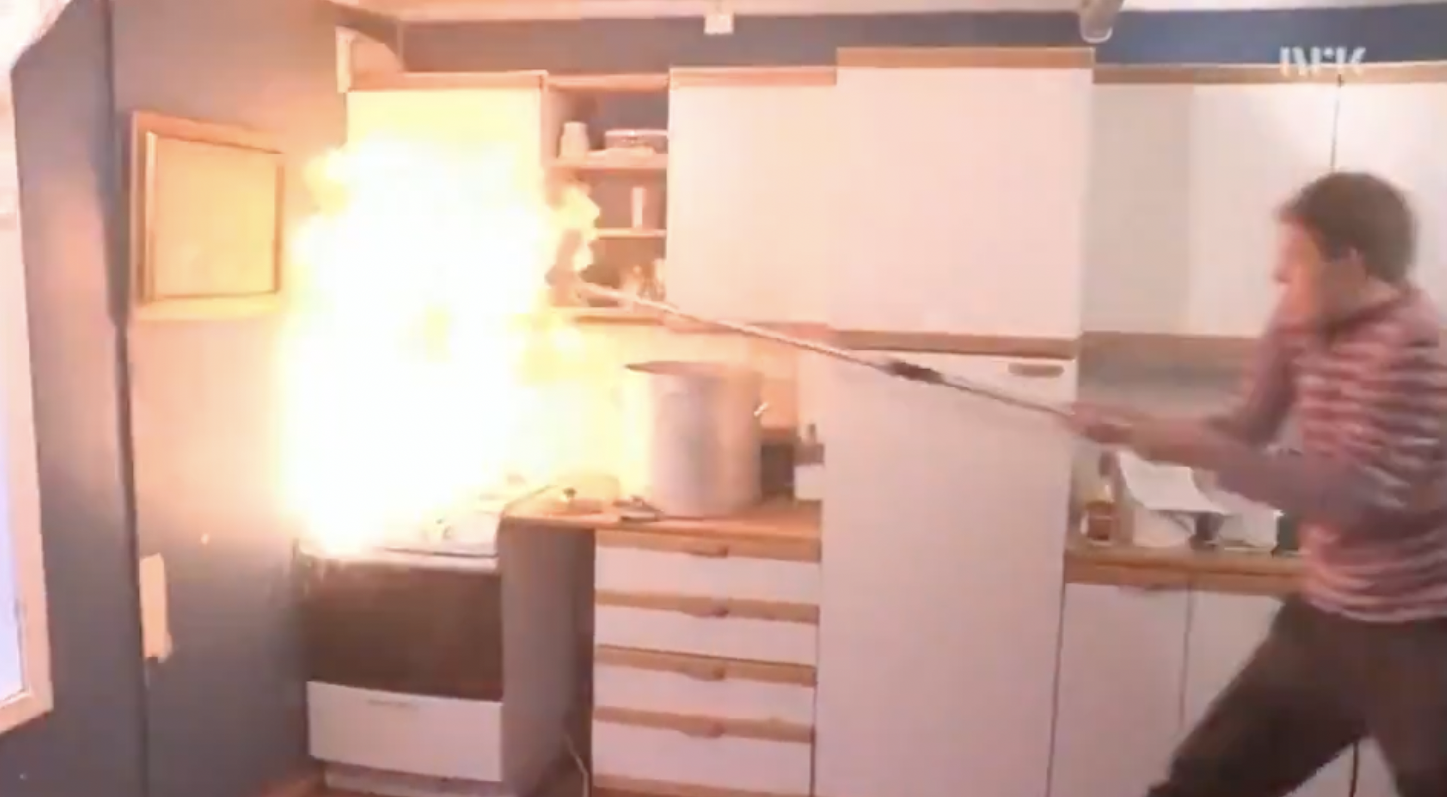 Este video publicado en redes sociales muestra lo que pasa cuando agregamos agua a un sartén que está en llamas.