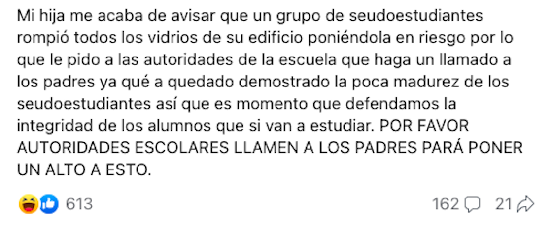 “POR FAVOR AUTORIDADES ESCOLARES LLAMEN A LOS PADRES PARÁ PONER UN ALTO A ESTO”, se lee en una publicación de Facebook.