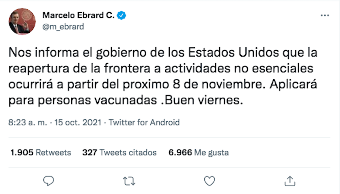 “Nos informa el gobierno de Estados Unidos que la reapertura de la frontera a actividades no esenciales ocurrirá a partir del próximo 8 de noviembre. Aplicará para personas vacunadas”.