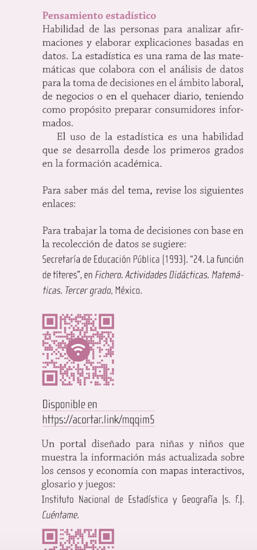 Sin embargo, todos los libros de texto tienen recuadros que se llaman “Profundicemos” dirigidos a maestros. Vean este pedazo del libro de 3º de primaria en el que serán los profesores quienes tengan que explicar —como buenamente se pueda— de qué se trata el pensamiento estadístico:
