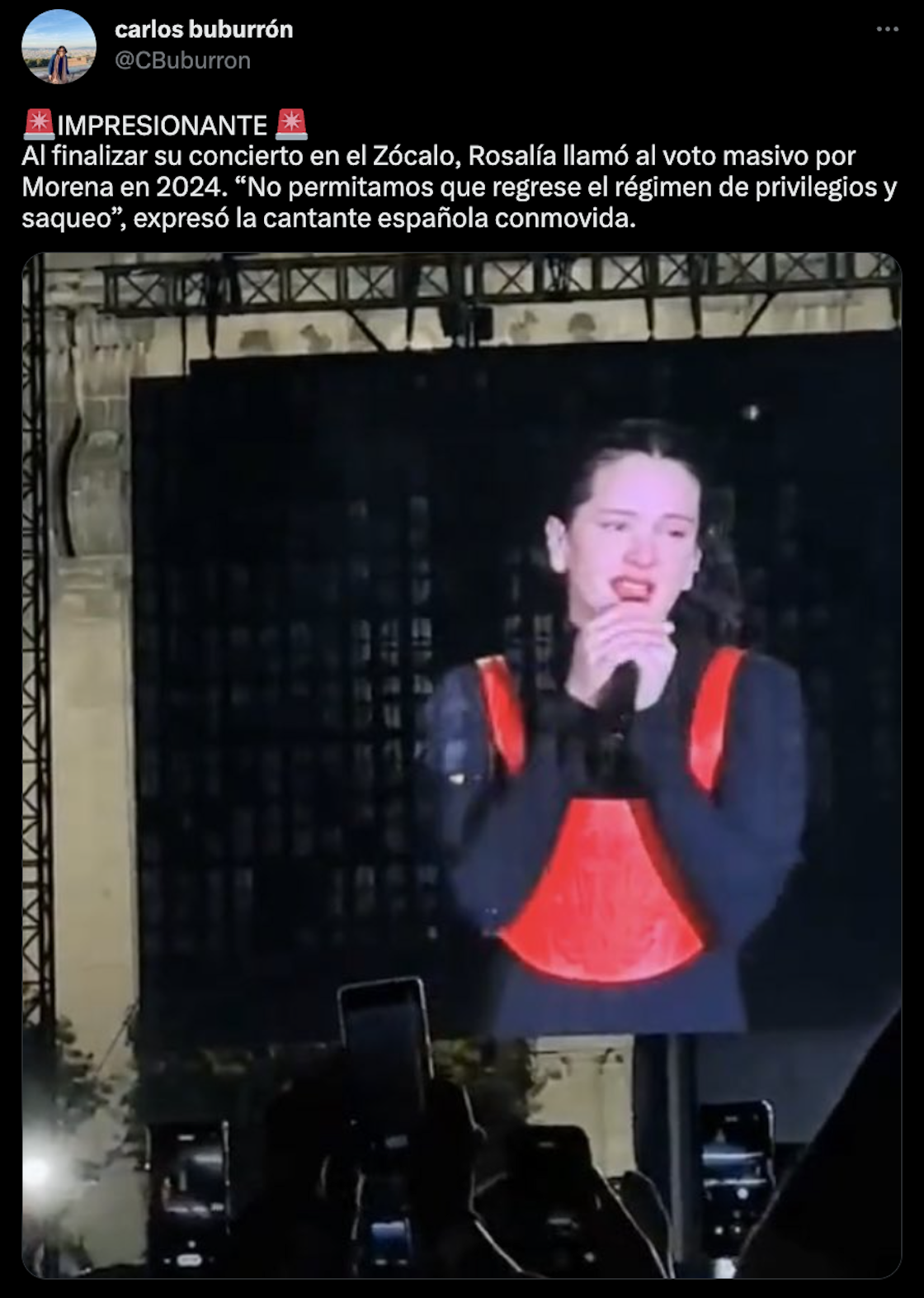 Al finalizar su concierto en el Zócalo, Rosalía llamó al voto masivo por Morena en 2024. “No permitamos que regrese el régimen de privilegios y saqueo”, expresó la cantante española conmovida.
