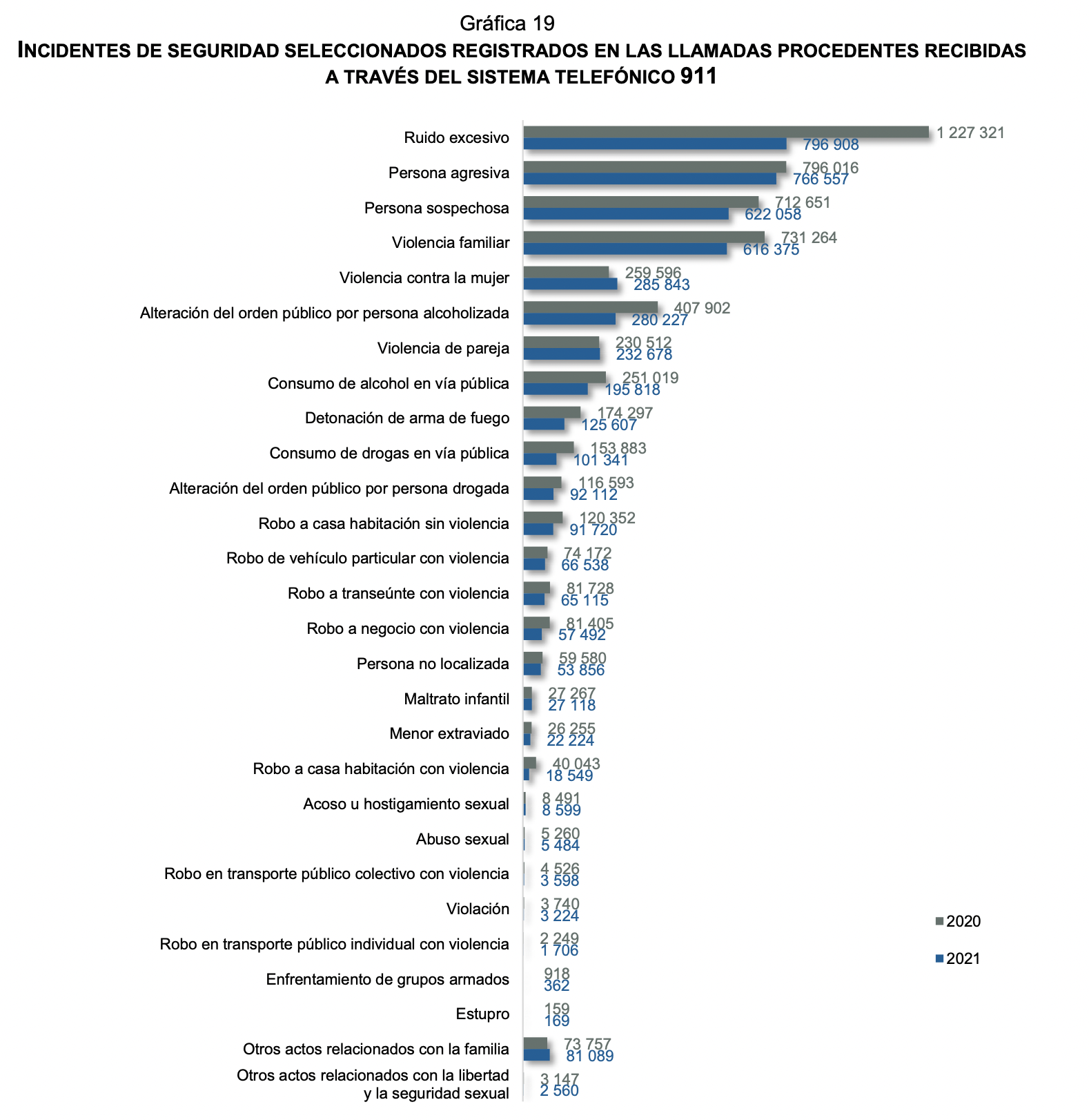 En color azul está el año 2021 y en color gris vemos el 2020, para poder ver cómo han ido cambiando las llamadas al 911 y al menos, en el caso del ruido, como parece que aprendimos a convivir con los vecinos.