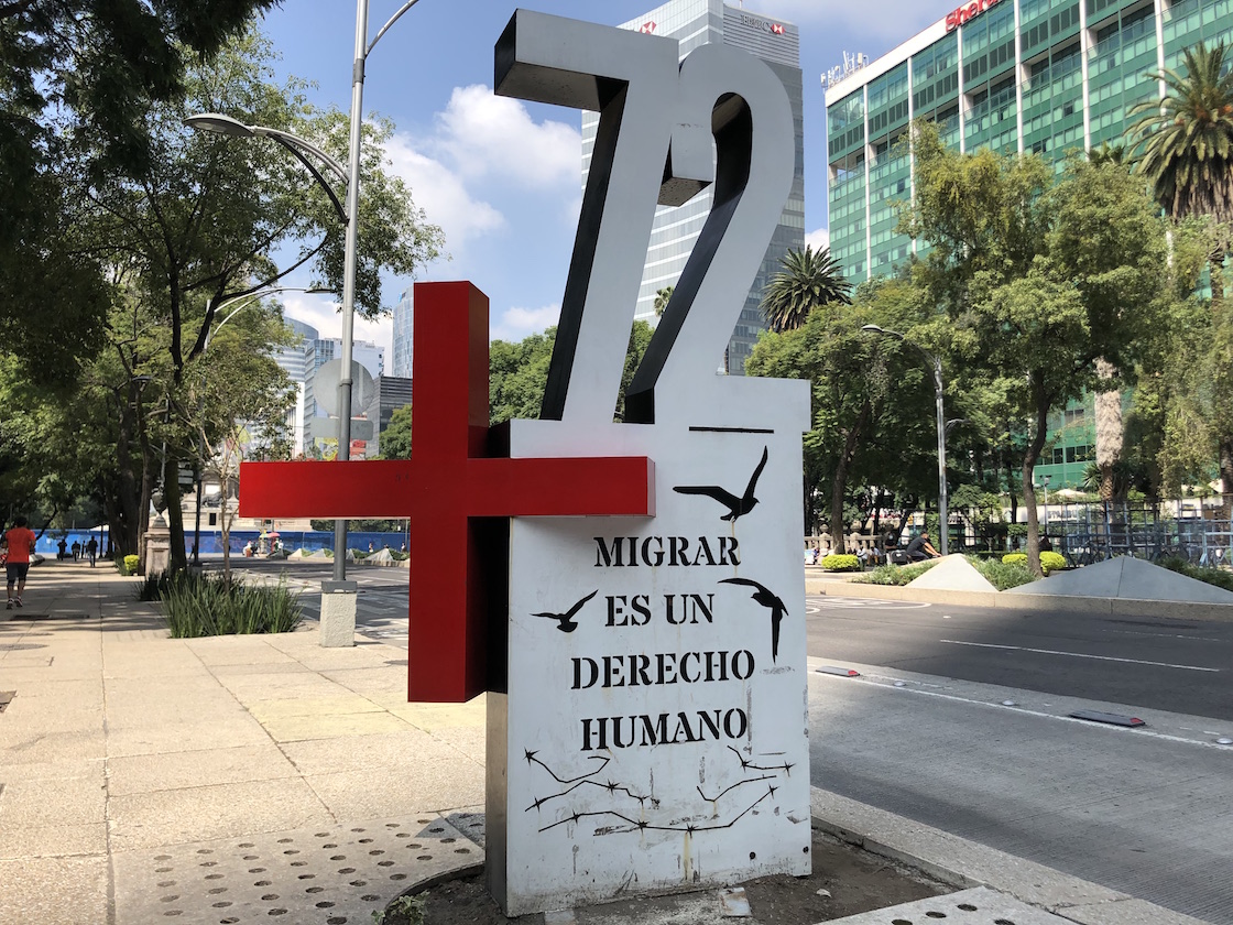 El Antimonumento a los migrantes, que lo encuentran sobre el camellón, recuerda las vidas perdidas en rojo y tiene dos caras. En una recuerdan que migrar es un derecho humano y en la otra, mantienen un mensaje. “Nadie es ilegal en el mundo”.