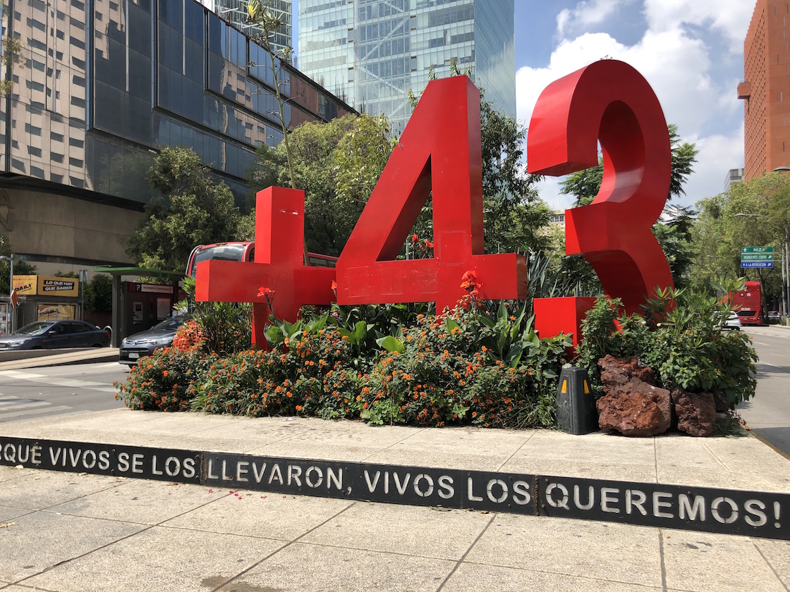 Ahí, frente a la enorme torre construida en los ochenta y a un costado de la sede de la Lotería Nacional, vamos a encontrarnos con el recuerdo a los 43 estudiantes desaparecidos de Ayotzinapa.