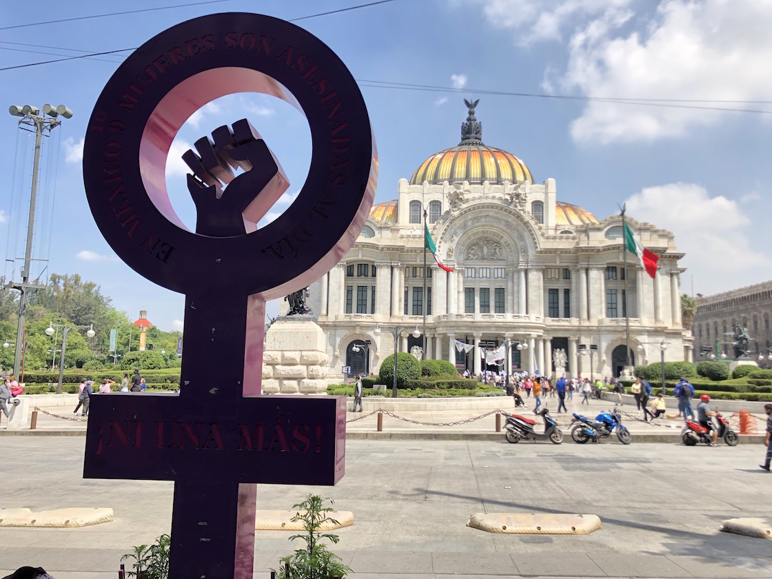 Sobre Avenida Juárez, caminamos un poco más enfilándonos hacia el Zócalo y llegamos al Palacio de Bellas Artes, esplendoroso. Sin embargo, en la banqueta de enfrente recordamos la violencia que se vive en México, específicamente la violencia feminicida y la violencia de género.