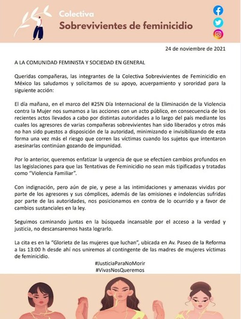 A la 1 de la tarde, la Colectiva Sobrevivientes de feminicidio se hará presente en la Glorieta de las Mujeres que Luchan para unirse al contingente de Madres de mujeres víctimas de feminicidio.