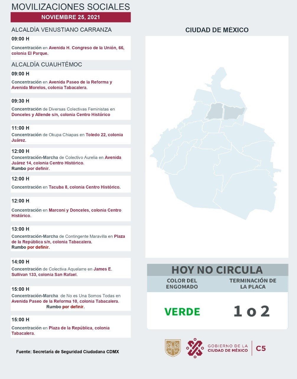 De acuerdo con el Centro de Comando, Control, Cómputo, Comunicaciones y Contacto Ciudadano de CDMX (el C5), a partir de las 9:30 de la mañana inició la primera concentración —en Reforma y Avenida Morelos— en torno al 25N.