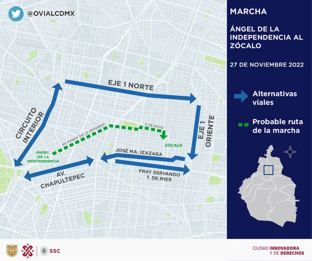 Así que si ustedes van a salir este domingo, de una vez les recordamos que los manifestantes pasarán por Avenida Paseo de la Reforma, Avenida Juárez, el Eje Central Lázaro Cárdenas, así como la Avenida de 5 de Mayo para llegar al Zócalo de la CDMX.