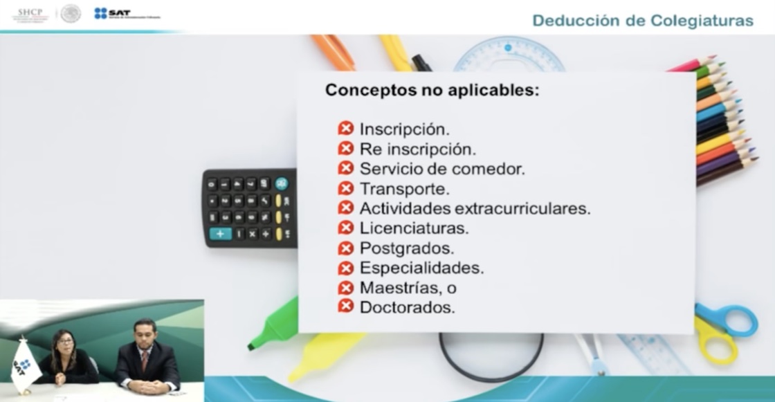 Esta chance para deducir las colegiaturas aplica tanto para cónyuges, concubinos, familiares ascendentes o descendentes en línea directa —ya saben, mamás, papás, suegros, suegras— ooooo para sí mismos.