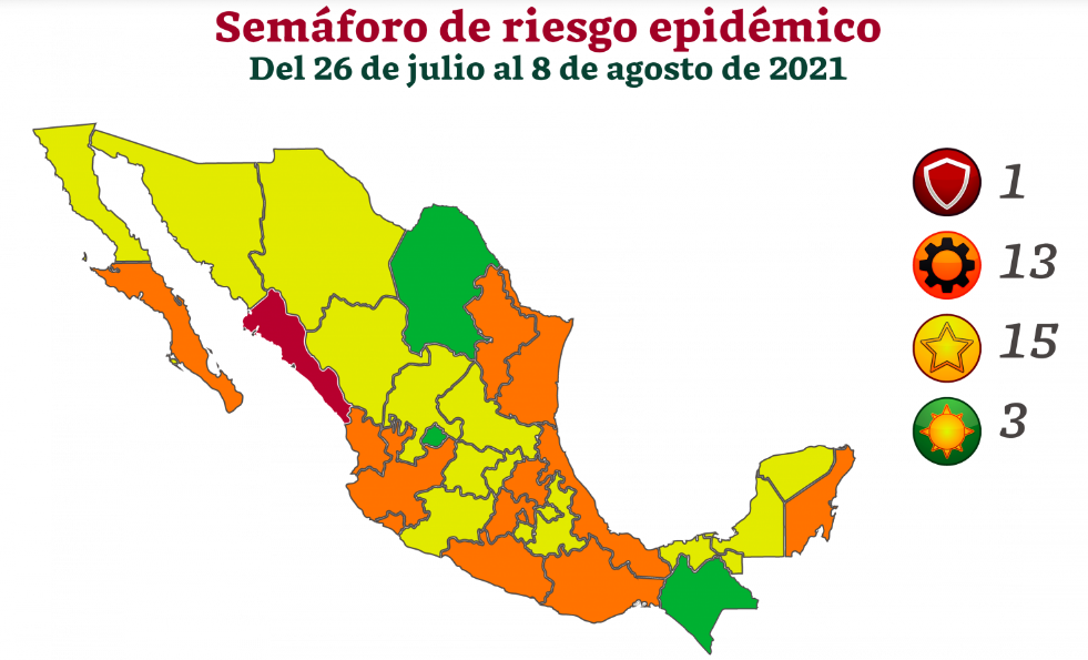 De acuerdo con la Secretaría de Salud, del 26 de julio al 8 de agosto de 2021 un estado regresará a semáforo rojo, 13 se quedarán en naranja, 15 estados permanecerán en amarillo y solo tres estarán en verde.