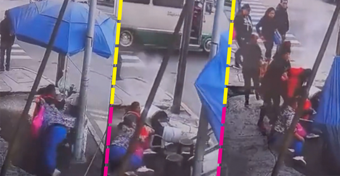 Como la señora no se logra sostener en su banquito, cae y empuja la olla de los tamales, la cual tenía instalada a lado de la mesita, que también se derrumba con todo lo que tenía puesto encima, así como la sombrilla azul que protegía el puesto. Al final de video se ve como las personas de las esquina corren y ayudan a las dos señoras que estaban sobre la banqueta.