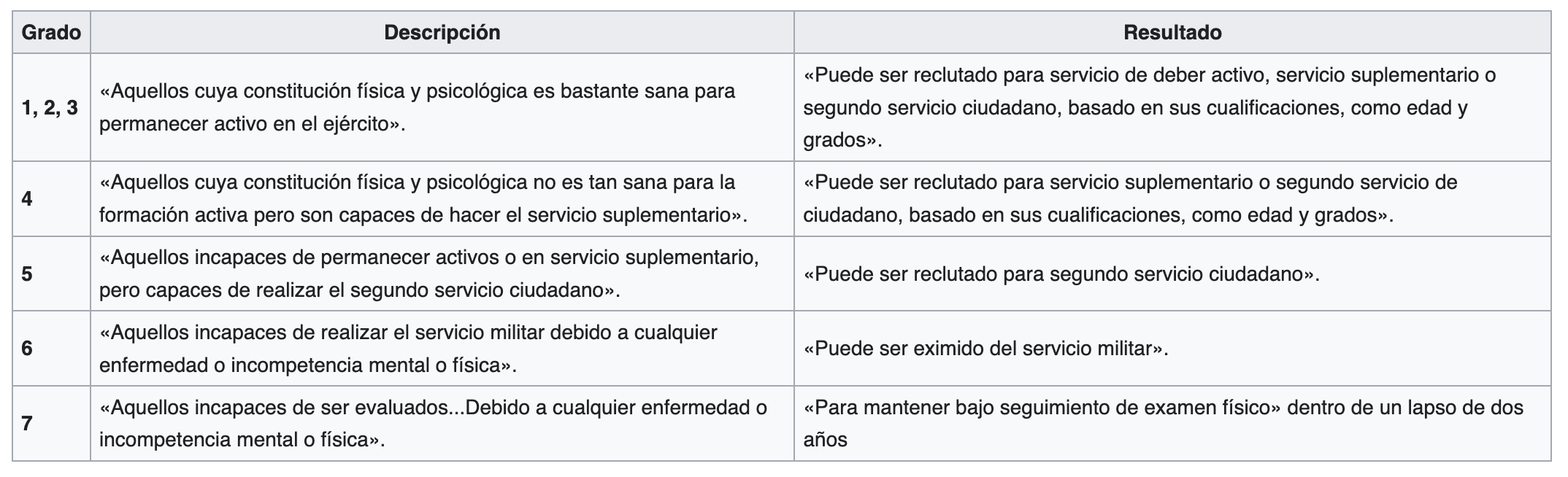 Cuando cumple 19 o 20 años le hacen un examen físico para saber si podrá enlistarse. A partir de ese examen se les da un grado que determina si pueden o no enlistarse y en qué actividades.
