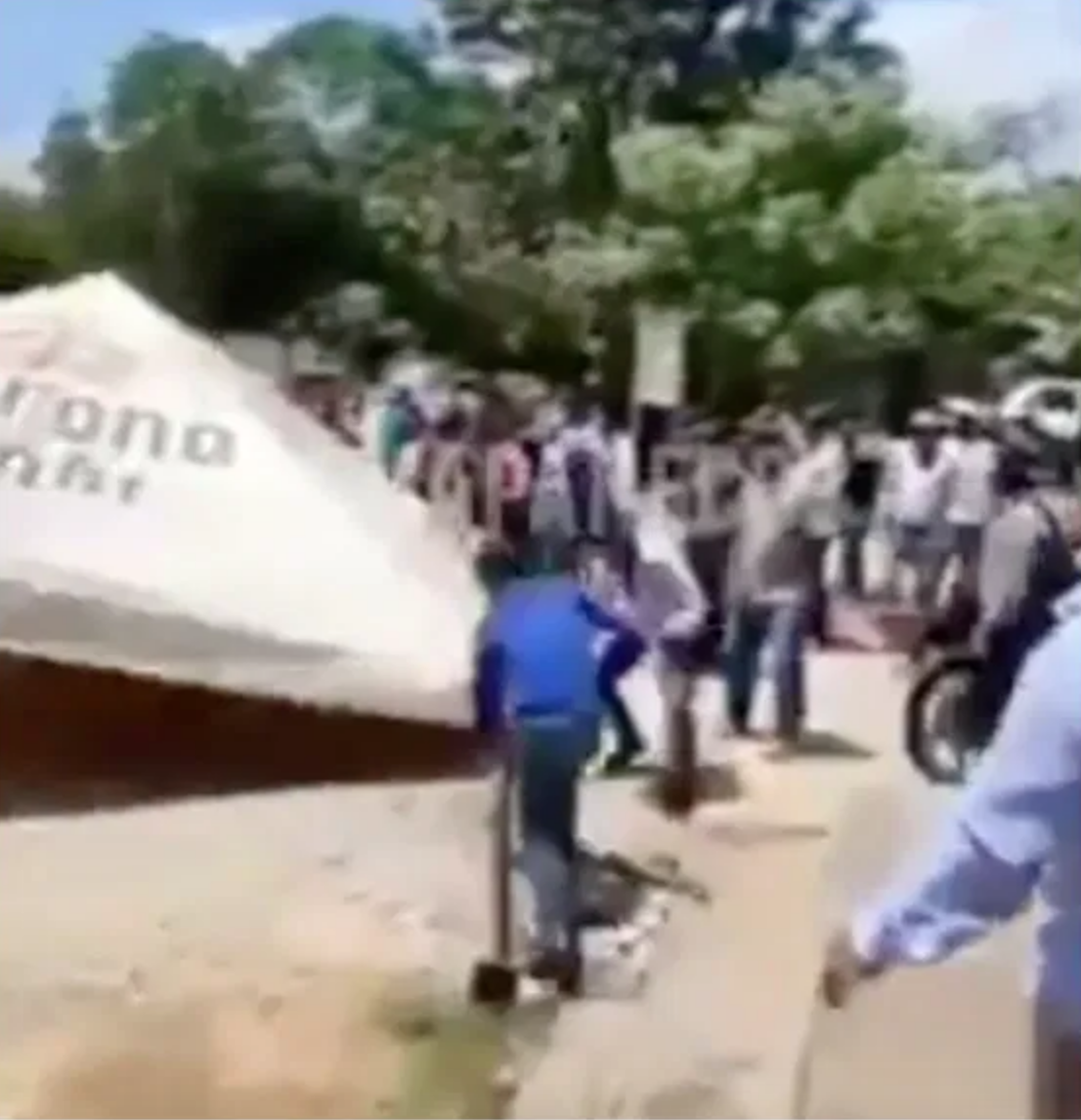 Un par de videos posteados en redes sociales muestran el momento en el que presuntos simpatizantes de Morena llegan a derribar un toldo que pertenecería al PES. “Mira nada más que están haciendo los de Morena”, dice un hombre que graba lo sucedido y quien al final parece ser atacado por alguien, pues la cámara del celular se mueve y la grabación se detiene.