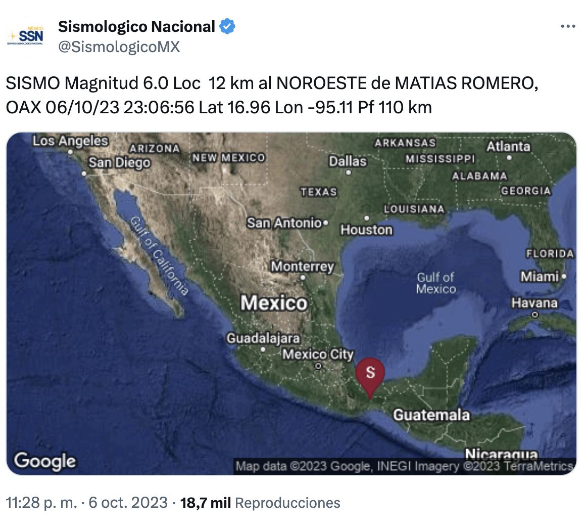 De acuerdo con el reporte del Sismológico Nacional, la magnitud fue de 6 con epicentro aproximadamente a 12 kilómetros al noroeste de Matías Romero, en el estado de Oaxaca.