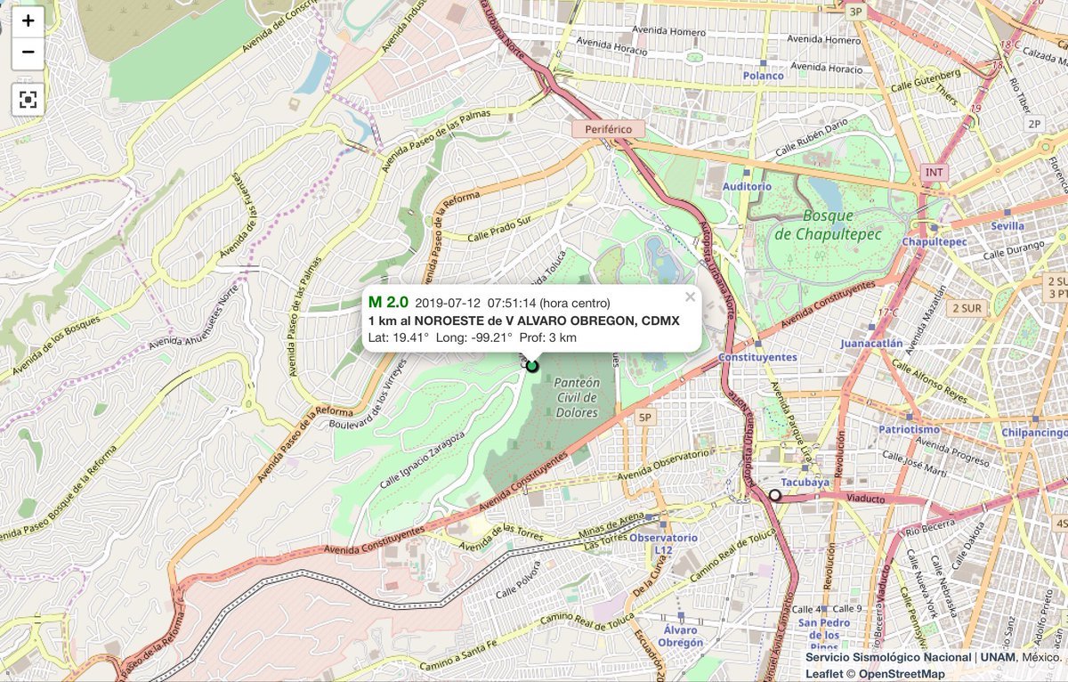 SISMO Magnitud 2.0 Loc. 1 km al NOROESTE de V ALVARO OBREGON, CDMX 12/07/19 07:51:14 Lat 19.41 Lon -99.21 Pf 3 km