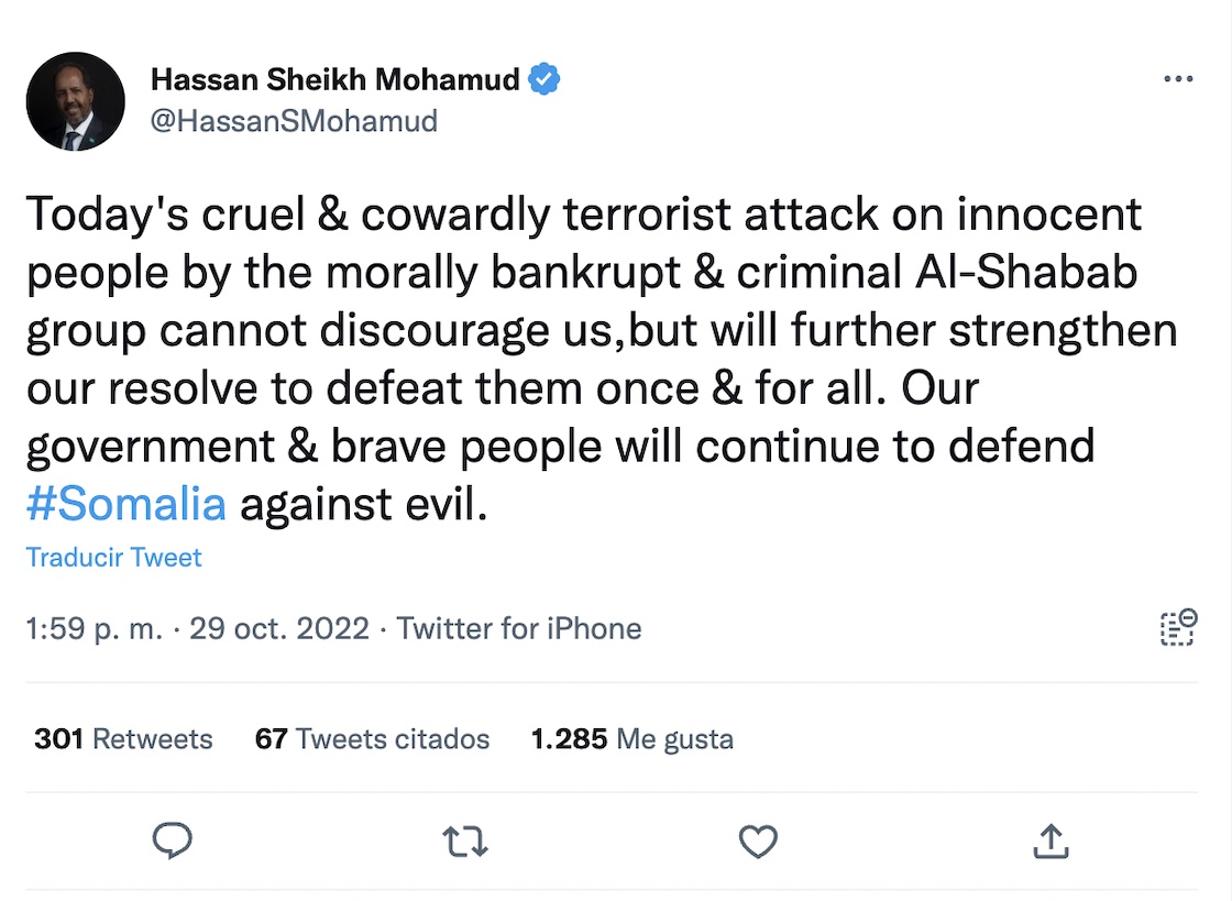 El mundo cerró el mes de octubre de 2022 con noticias que quisiéramos que no sucedieran. Desde Corea del Sur —con la estampida humana que dejó más de cien personas muertas— hasta Somalia. Y tal vez lo que pasó en Seúl sonó un poco más en medios mexicanos, que el doble atentando terrorista en Mogadisco a cargo de Al Shabab.