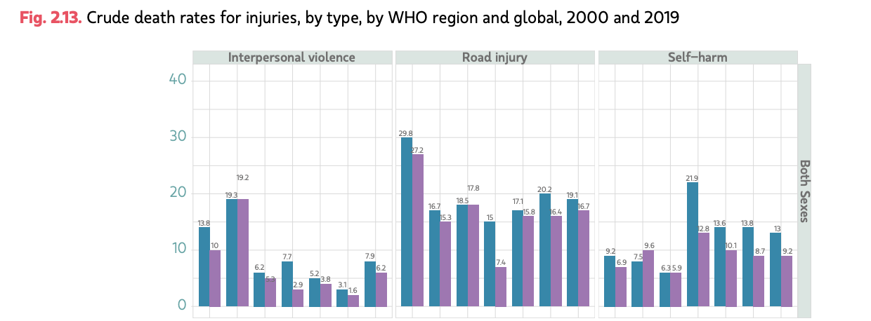La tasa de suicidio mundial en ese año fue de 9 personas por cada 100 mil. Las regiones que superaron esa media fueron África, Europa y Asia Sudoriental. La tasa de suicidio mas baja se registró en la región del Mediterráneo Oriental con 6.4 suicidios por cada 100 mil.