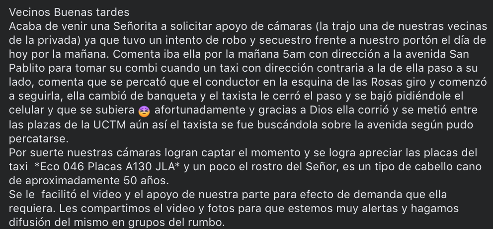 En la denuncia realizada se detalla que la joven del video pidió los videos en cuestión para realizar la denuncia correspondiente. “Se le facilitó el video y el apoyo de nuestra parte para efecto de demanda que ella requiera”, dice la persona que comparte las imágenes y quien pide a los vecinos estar alertar y difundir el caso en cuestión para que los habitantes tengan precaución.