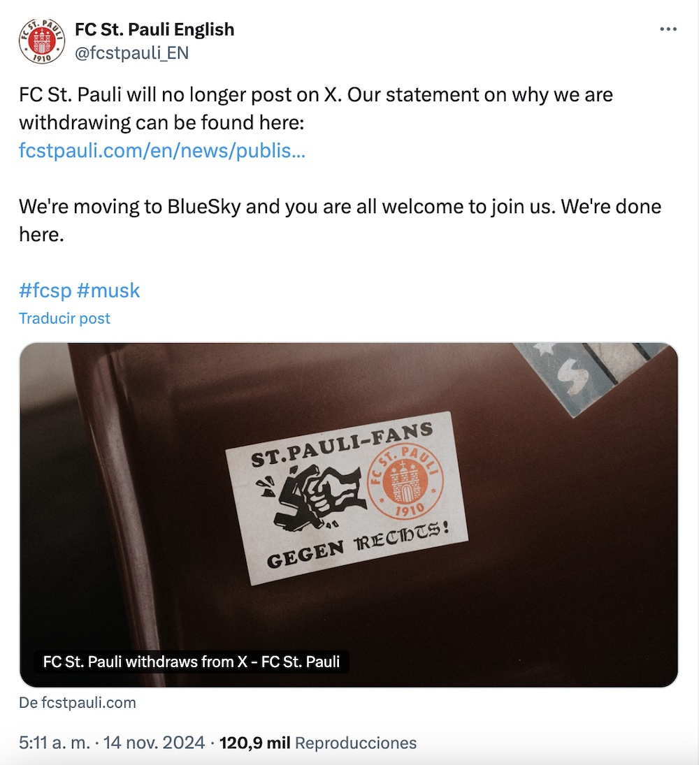 El duro mensaje del FC St. Pauli señaló que en X es seguro que se sigan promoviendo los discursos —muchas veces exagerados y falsos— de la extrema derecha, más en las próximas elecciones de Alemania.