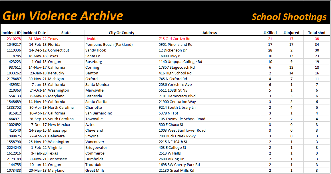 El asunto es que los tiroteos masivos en escuelas encabezan la lista de la violencia.