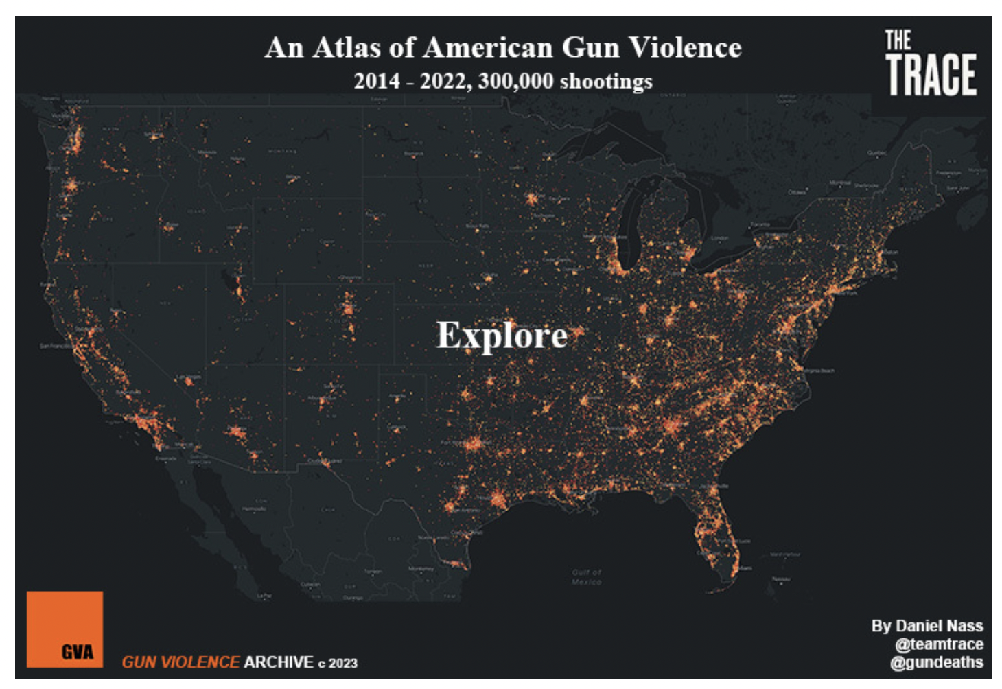 Además, en lo que va del 2023 se reportan 30 mil 631 lesionados por armas de fuego. Así es como se ve el mapa de tiroteos, cada punto rojo es una muerte relacionada con un arma en el periodo entre 2014 y 2022.