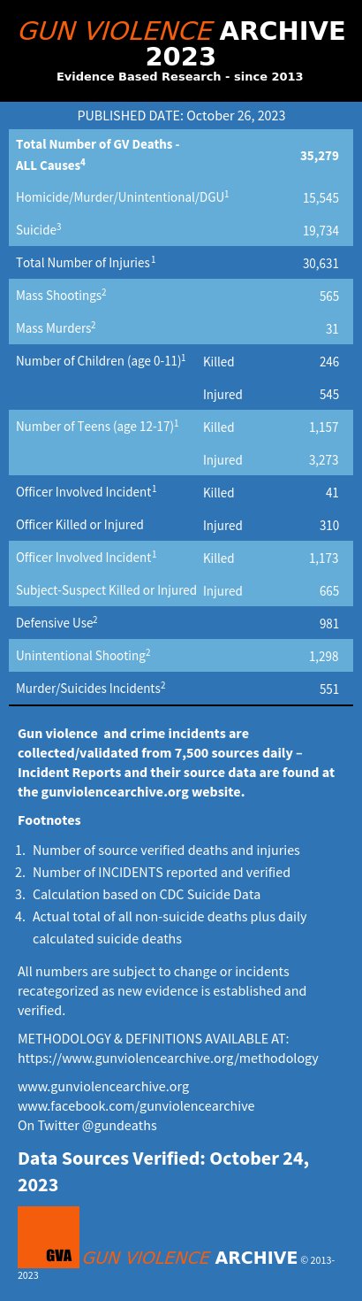 La organización ha mapeado un total de 35 mil 279 muertes causadas por la violencia con armas, de las cuales 15 mil 545 fueron causadas por homicidio o asesinato no intencional. Las más de 19 mil restantes son suicidios.