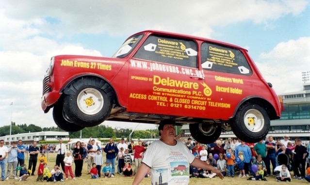 John Evans es famoso por su acto de balancear un auto sobre su cabeza, ya saben, algo de todos los días. El joven e intrépido muchacho se hizo del récord mundial ya mencionado cuando puso un auto de 160 kilos sobre su cabeza y lo mantuvo en perfecto balance durante 30 segundos.