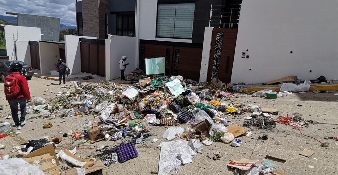 Fotos y videos muestran como los trabajadores de limpia tiran la basura en la calle frente a la propiedad del alcalde, en la que además dejaron una bandera que decía “Para el peor presidente de Oaxaca. Att: 3 de marzo“.
