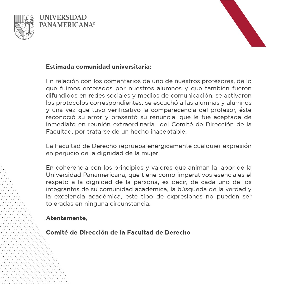 Por la actitud mostrada por el ahora exprofesor, la Universidad Panamericana difundió un comunicado en el que refrenda la reprobación de cualquier expresión dirigida en perjuicio de la dignidad de la mujer.