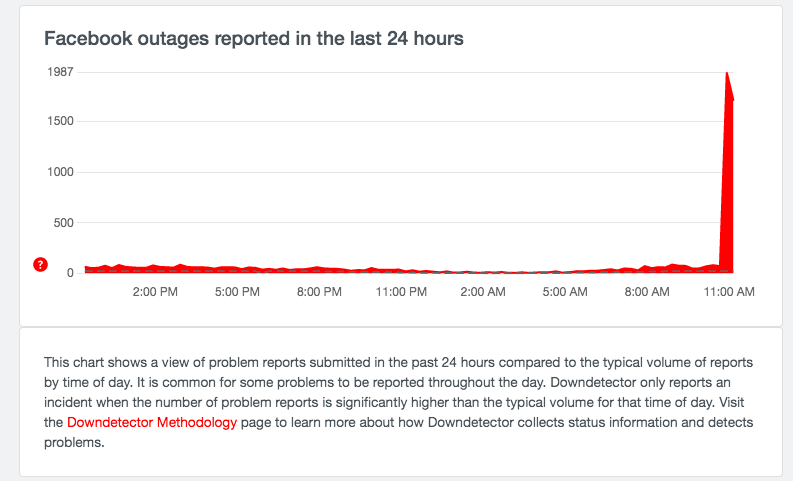 los reportes de fallas en Facebook comenzaron aproximadamente a las 10:30 de la mañana de este viernes 19 de noviembre y hasta el momento de publicación de esta nota, continúan.
