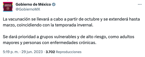 Primero hay que destacar que el documento de la Secretaría de Salud establece que la meta para lograr todo esto es septiembre de 2023, para que ya en octubre de este año arranque la aplicación estacional de la vacuna.