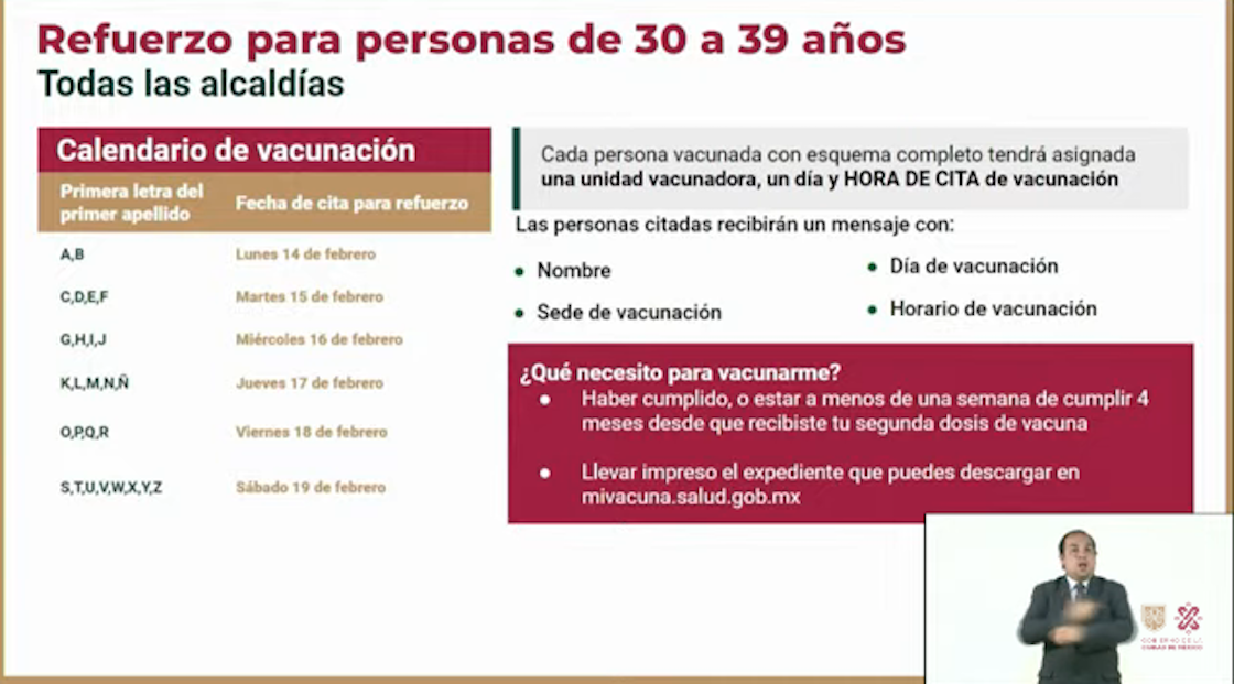 Lo que ya sabíamos es que del lunes 14 al sábado 19 de febrero, el gobierno CDMX estará aplicando la vacuna de refuerzo para personas de 30 a 39 años.