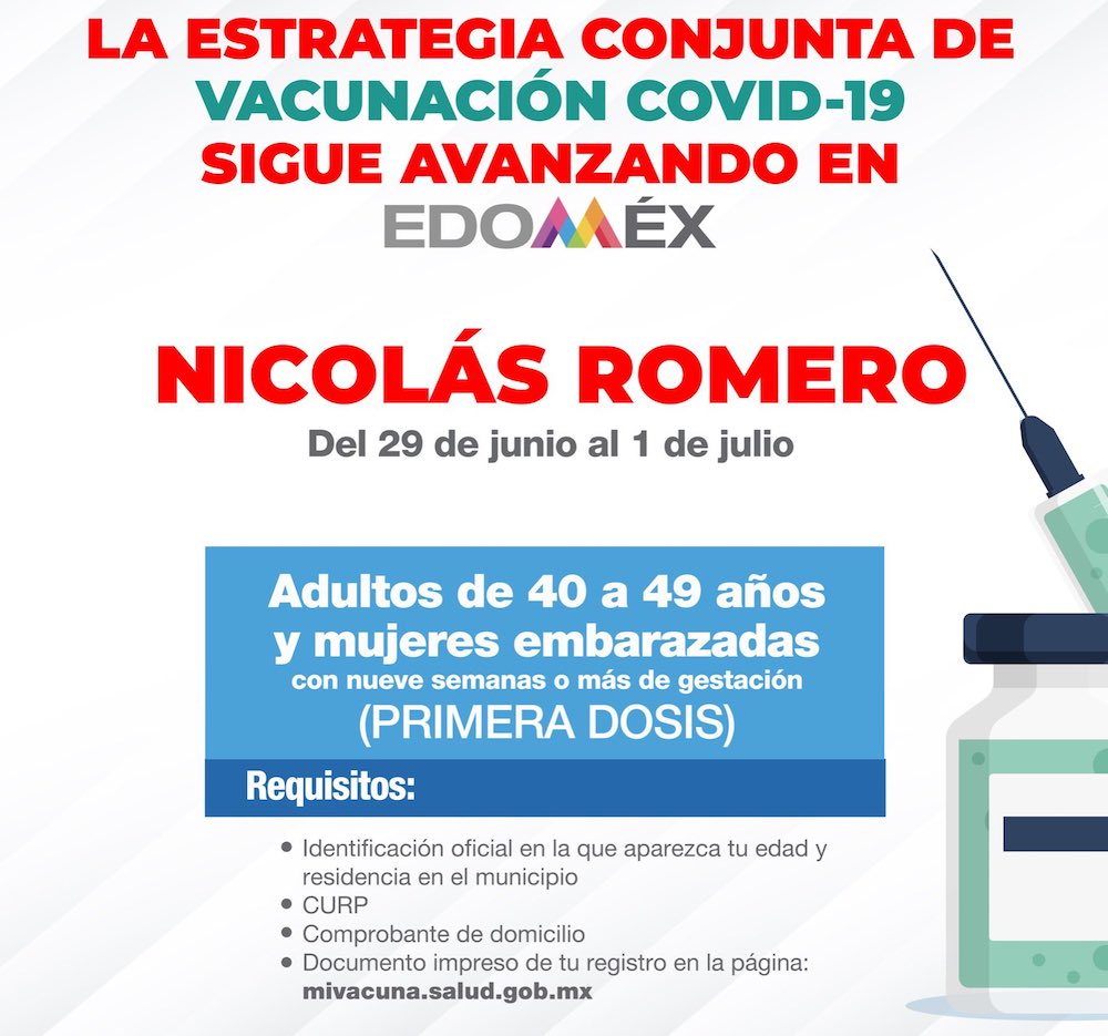 Va info que le interesa a las y los mexiquenses: a partir de este martes 29 de junio inicia la vacunación de personas de 40 a 49 años de edad —con la primera dosis— en los municipios de Naucalpan, Tlalnepantla, Coacalco, Atizapán, Nicolás Romero, Tepotzotlán, Coyotepec, Teoloyucan, Jilotzingo e Isidro Fabela, aunque las fechas en que las jornadas concluirán son distintas, de acuerdo con el gobierno del Estado de México.