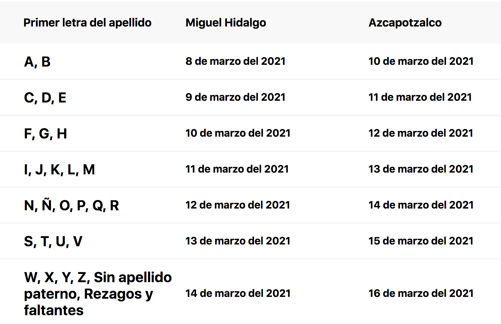 Las próximas alcaldías en las que iniciará la vacunación a adultos mayores serán Miguel Hidalgo y Azcapotzalco. Al igual que en demarcaciones anteriores, esta tercera etapa de inmunización COVID-19 se realizará por orden alfabético del 8 al 14 de marzo en el caso de la Miguel Hidalgo, y del 10 al 16 de marzo en Azcapotzalco.