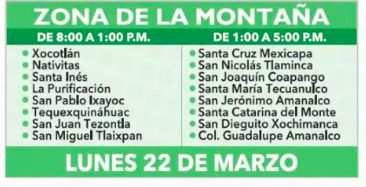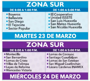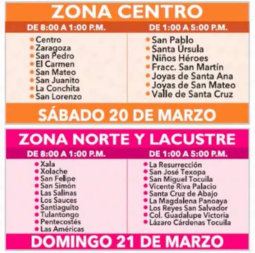 La inmunización iniciará en los días antes mencionados de 8 am y hasta las 5 pm. La organización de aplicación para las distintas localidades se organizó por bloques dependiendo de la zona del municipio.
