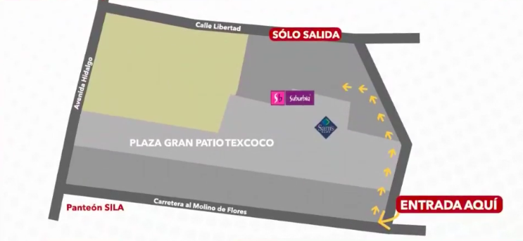 Este es el mapa de cómo funcionará la entrada para la sede de vacunación en el estacionamiento de atrás de Gran Patio Texcoco y el segundo es la sede del deportivo Silverio Pérez.