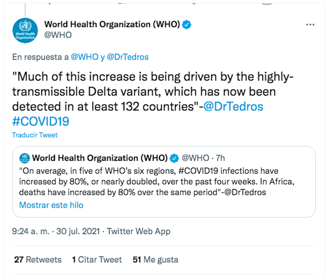 Así, ya directo y sin rodeos, Tedros Ghebreyesus dijo que el aumento de los contagios de COVID-19 en el mundo se deben, en parte, a la variante Delta, que es considerada como una de las más transmisibles y que ya está en al menos 132 países —entre ellos, México.