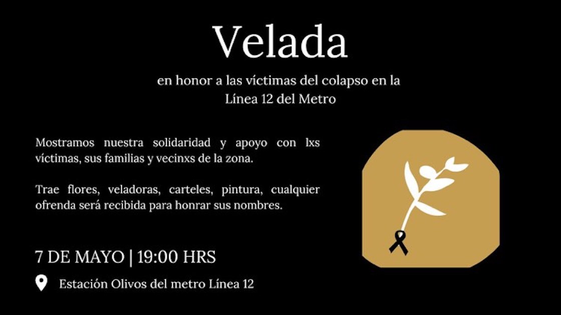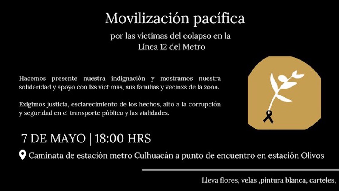 Por otra parte, la movilización pacífica por las víctimas del desplome de vagones en la Línea 12 del Sistema de Transporte Colectivo Metro, se realizará este viernes 7 de mayo a partir de las 18:00 horas. Sí, esta consistirá en caminar desde la estación Culhuacán hasta la estación Los Olivos, donde será el punto de encuentro.