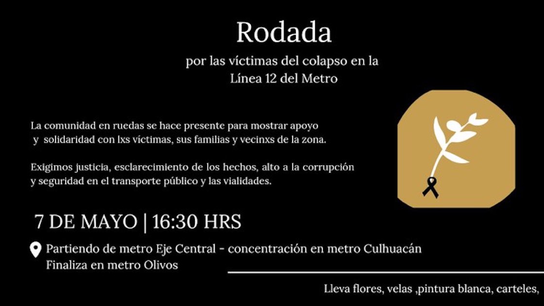 Finalmente, la rodada por las víctimas de la Línea 12 se hará mañana a partir de las 16:30 horas, la cual partirá de la estación Eje Central, se concentrará en la estación Culhuacán, y por último llegará a la estación Los Olivos. Al igual que con las otras dos manifestaciones, puedes llevar flores, velas, pintura blanca y carteles.