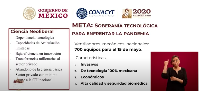 En julio del 2020, durante una conferencia matutina en Palacio Nacional, la directora general del Consejo Nacional de Ciencia y Tecnología (CONACYT), María Elena Álvarez-Buylla, presentó los ventiladores que habían desarrollado para la atención de pacientes graves con COVID-19.