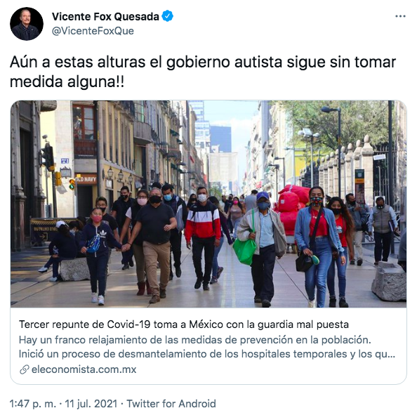 Desafortunado. Por medio de sus redes sociales, el pasado 11 de julio, el ex presidente mexicano Vicente Fox compartió una nota relacionada con el tercer repunte de COVID-19 en México una nota relacionada con el tercer repunte de COVID-19 en México, el proceso de desmantelamiento de los hospitales temporales y el despido de personal de salud.
