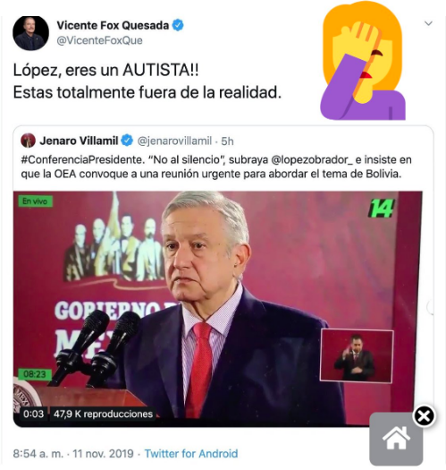 Y no es la primera vez que lo hace. El 11 de noviembre de 2019, Fox compartió un tuit publicado por Jenaro Villamil que se refería a la insistencia de AMLO en convocar una reunión de la Organización de Estados Americanos (OEA) para tratar el tema de Bolivia.