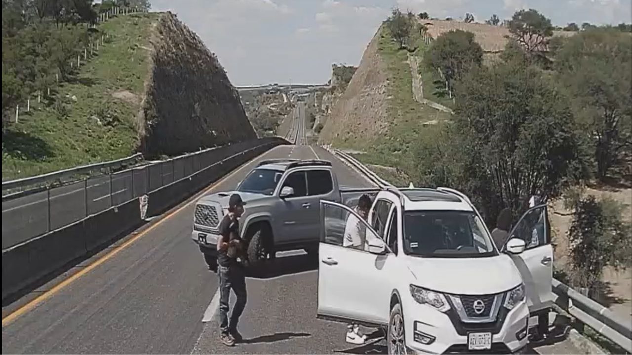 Aunque a primera vista no se aprecia nada fuera de lo común, el video toma sentido cuando de una camioneta de carga salen dos sujetos (uno con un arma larga) que bajan a una pareja de la camioneta blanca para llevarse el vehículo al sentido contrario.