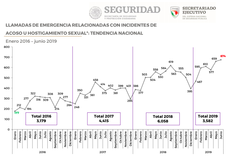De acuerdo con cifras del Secretario Ejecutivo del Sistema Nacional de Seguridad Pública (SESNSP) en lo que va del año se han registrado 3 mil 582 llamadas de emergencia relacionadas con incidentes de hostigamiento sexual o acoso, una cifra que parece ir a la alza y que alcanzó un récord de 674 llamadas durante el mes de junio, un número que duplica los presentados en el mismo mes de 2016.