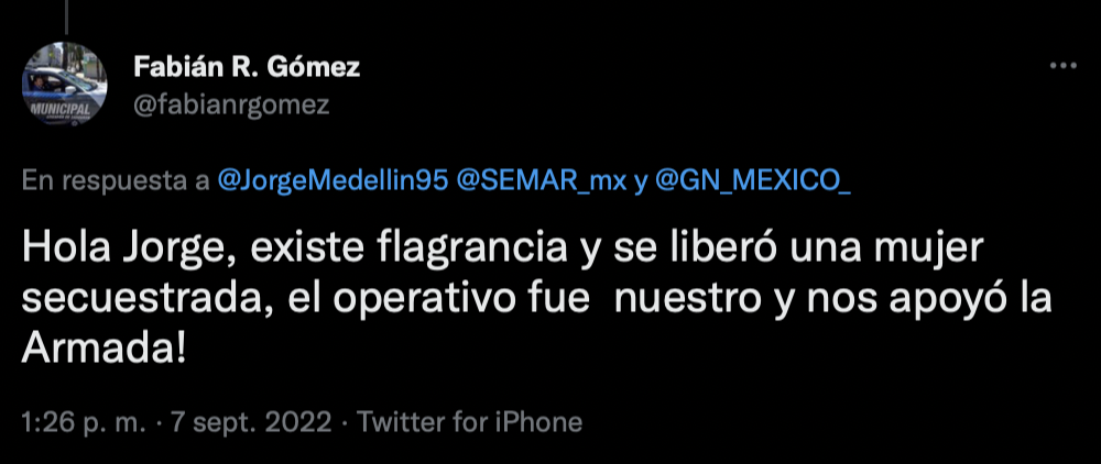 “Se liberó una mujer secuestrada”, explicó Fabián Gómez, en su cuenta de Twitter. “El operativo fue nuestro y nos apoyó la Armada“, decía el Director de Seguridad Pública del municipio de Atizapán para frenar el pánico por este video de marinos abriendo cajuelas.