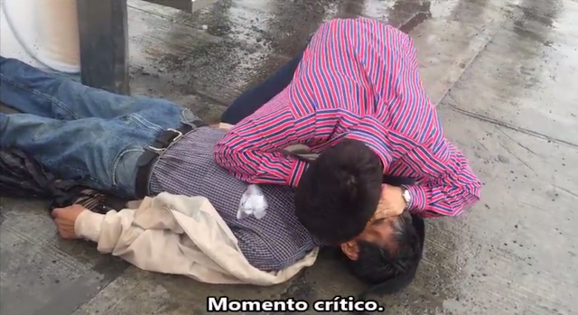 En el video hay un hombre tirado en una parada del camión. En ese momento aparece el Pato Zambrano, muy casual, caminando, cuando un testigo le informa sobre la emergencia: -Se pegó en la cabeza. Zambrano se acerca al hombre para asistirlo.