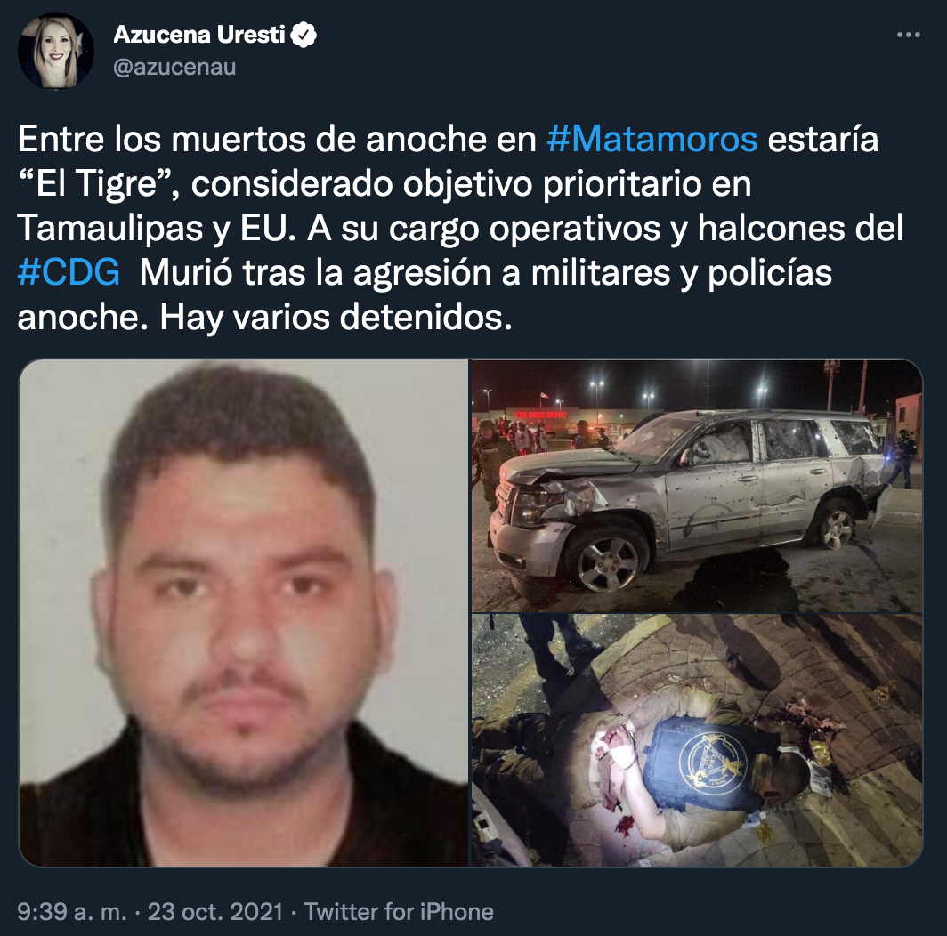 A través de un comunicado, el gobernador de Tamaulipas informó que el enfrentamiento armado dejó un saldo de dos heridos y un civil muerto. Entre los muertos estaría Ariel Treviño Peña alias “El Tigre”, encargado de operativos del Cartel del Golfo y quien era considerado objetivo prioritario por las autoridades de Tamaulipas y Estados Unidos.
