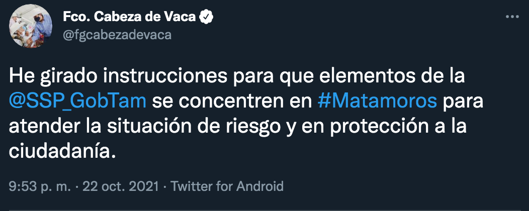 La noche del viernes 22 de octubre se registraron una serie de bloqueos y balaceras en varias calles de dicha ciudad perteneciente al estado de Tamaulipas. De hecho, la situación en Matamoros era tan grave que el gobernador de la entidad, el panista Francisco García Cabeza de Vaca, mandó a agentes a reforzar la seguridad.