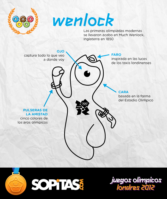 Su nombre está basado en la ciudad Much Wenlock, Inglaterra, donde se llevaron a cabo las primeras olimpiadas modernas en el año de 1950. La forma de su cuerpo está relacionada con el logotipo de Londres 2012. Su rostro está basado en la forma del Estadio Olímpico. ¡Ah y tiene una hermana llamada Mandeville!