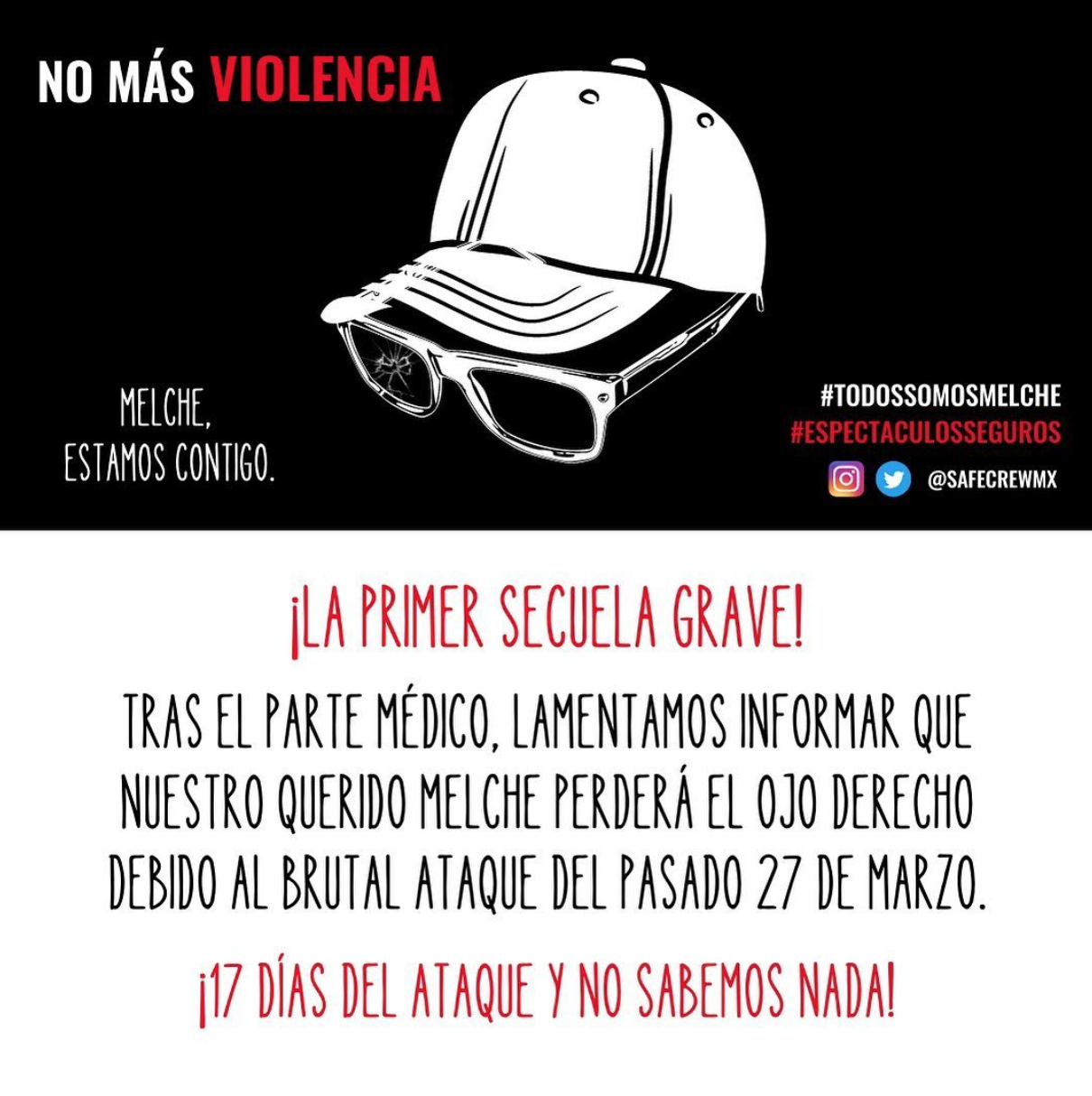 Ahora se sabe la primera secuela grave: “Tras el parte médico, lamentamos informar que nuestro querido Melche perderá el ojo derecho debido al brutal ataque del pasado 27 de marzo”.